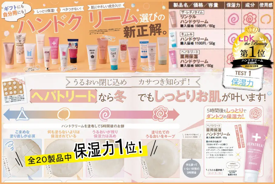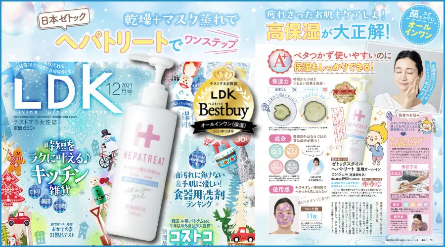 雑誌「LDK the Beauty」にて、ヘパトリート薬用オールインワンジェル、ヘパトリート薬用保湿ハンドクリームが紹介されました。
