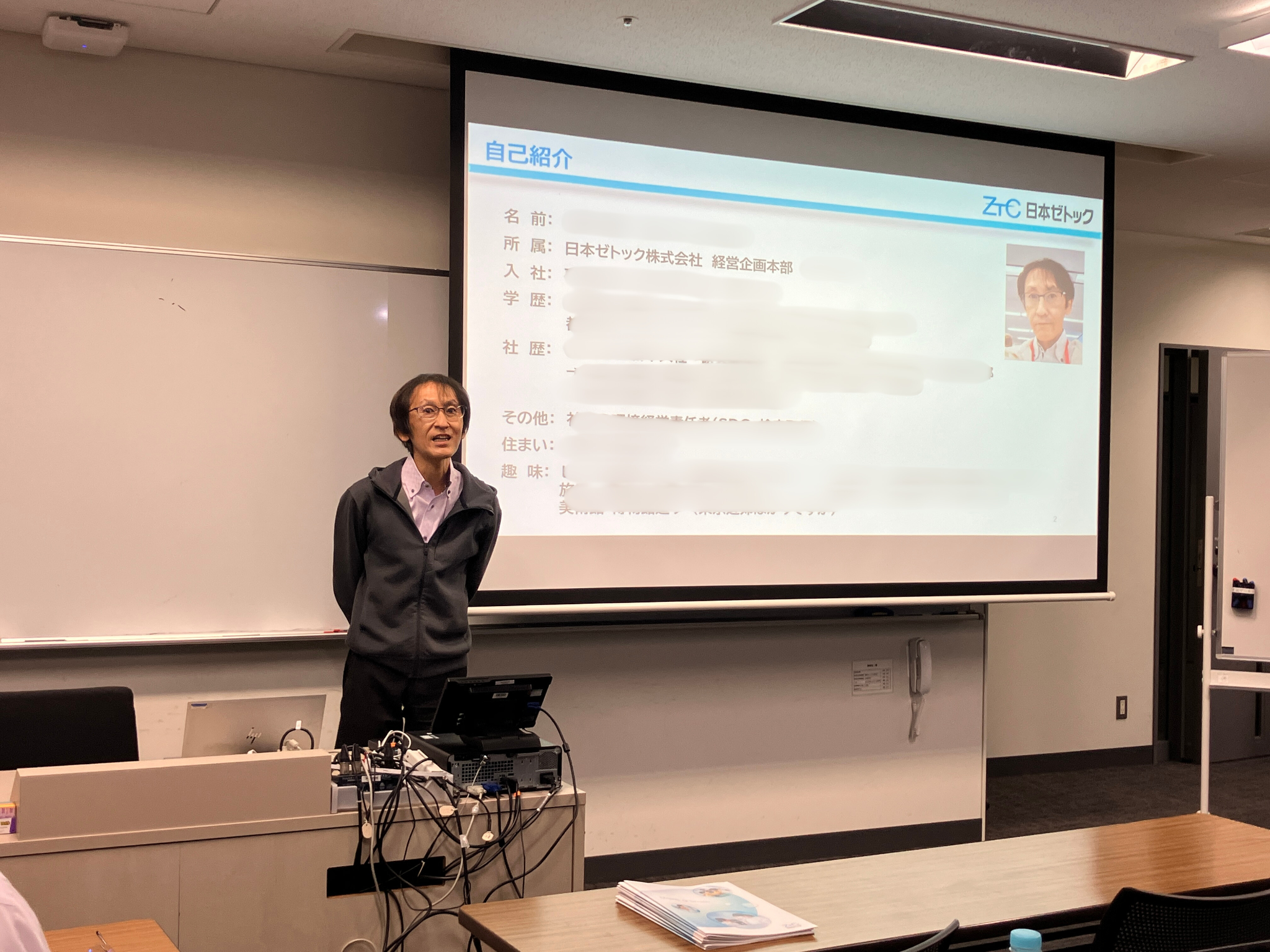講義全体のテーマは「知的資産に関する理解を深め、企業の持続的成長のための経営デザインを考える」であり、全15回で構成されています。その中で3回に当社経営企画部の担当者が登壇し、当社の企業戦略、事業開発、知的財産の活用などについて講義を行うと共に、講義の課題である日本ゼトックで取り組みたい新規事業について議論やアドバイスを行いました。